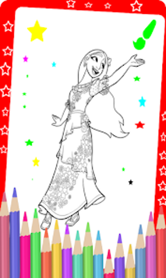 Aplikacja zawiera wiele postaci z serialu anime „Encanto”, dzięki czemu można kolorować i malować postacie z serialu. Możesz pokolorować postacie za pomocą kredek lub pomalować je różnymi kolorami. Możesz także zmienić tło i użyć różnych rodzajów papieru lub książek.